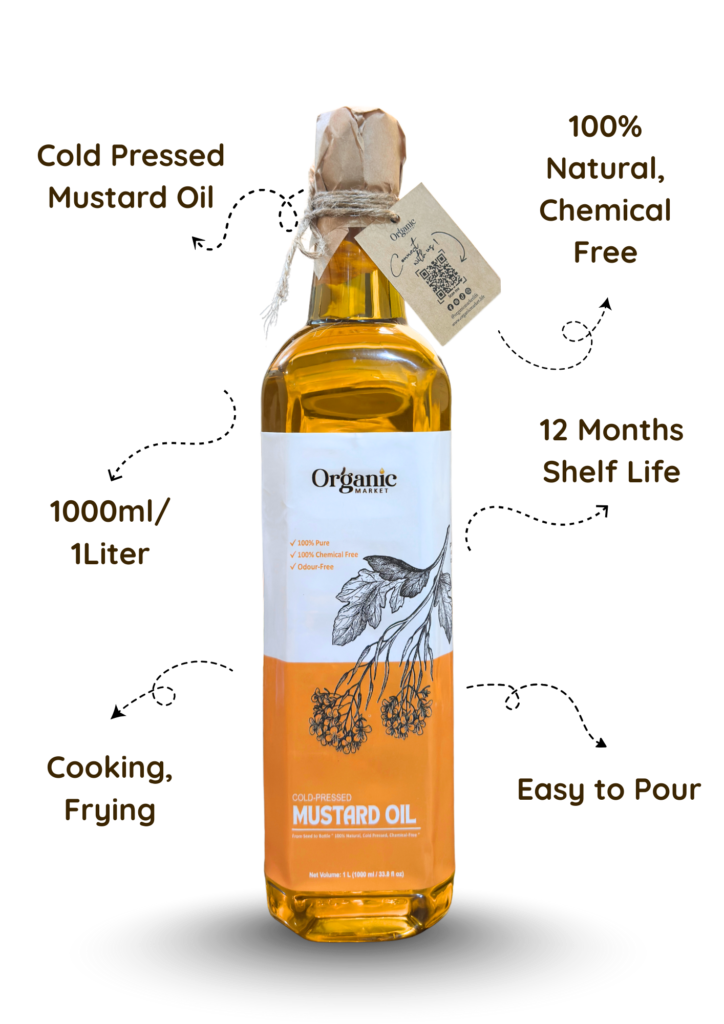 Our Organic Market Mustard Oil is extracted through a traditional cold-pressed method that keeps all nutrients intact. Rich in Omega-3, antioxidants, and natural aroma, it is perfect for cooking, and pickles. No chemicals, no heat processing — pure quality guaranteed.